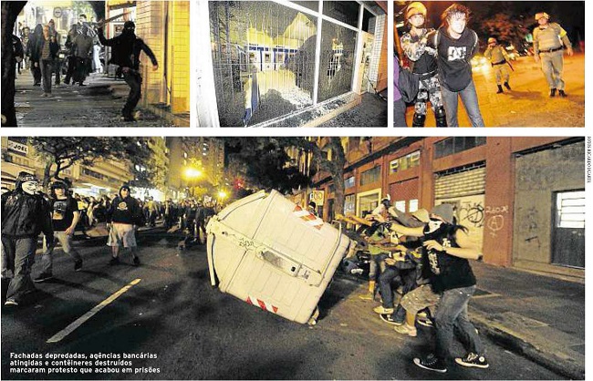 Segue-se ao título da notícia a descrição das consequências da noite de protesto, com a ressalva de que o ato teria se iniciado de forma “pacífica”. Ao longo do texto, são narradas diversas situações nas quais os manifestantes teriam sido protagonistas de ações conflitivas. Dentre elas, a notícia cita, além de danos a patrimônios públicos e privados, uso de sinalizadores, pichações, ameaças a jornalistas, bloqueio ao trânsito, consumo de maconha e cocaína e porte de soco-inglês. Para ilustrar essas ocorrências, todas as imagens da notícia possuem como tema manifestantes causando danos a patrimônios ou sendo presos. As fotografias ocupam cerca de metade do espaço da página (Figura 6).