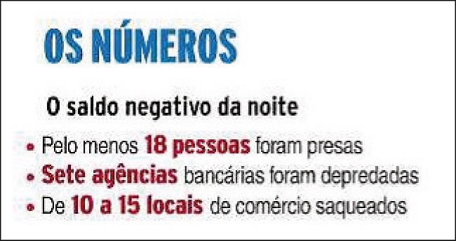 Por outro turno, em relação à atuação policial, Zero Hora segue a diretriz já apontada nos demais protestos. É dito que, no início do protesto, a Guarda Municipal cumpriu a função de fazer um “cordão de isolamento” em frente à Prefeitura. Quando da deflagração do confronto, o jornal não detalha a ação policial. Narra-se que, após serem atacados por manifestantes (com “coquetel molotov e pedras”), teriam os policiais reprimido os ativistas “com bombas de gás lacrimogêneo e outras armas de efeito moral”. Como resultado da ação policial, é informado que “pelo menos 18 pessoas foram presas”. Como “saldo negativo da noite”, Zero Hora publica o seguinte quadro apresentado na Figura 9.