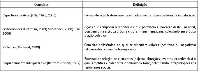 Os conceitos de repertório, performance, violência e enquadramento midiático, articulados, compõem o quadro teórico a partir do qual é operacionalizado este estudo. Os conceitos mobilizados são apresentados no Quadro 1.