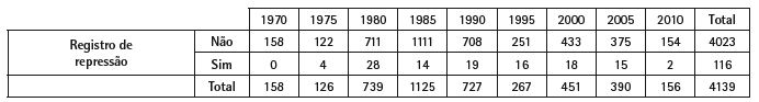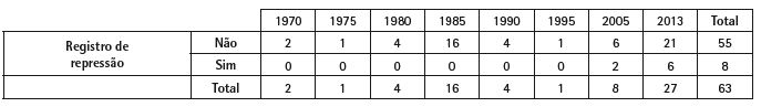 Os dados demonstram que, no total de registros, aproximadamente 3% dos casos apresentam repressão policial. Os anos de 1995, 2000 e 2005 foram os períodos com maior registro, apresentando 6%, 4% e 3,8% respectivamente (proporcionalmente ao número de casos registrados em cada um dos anos- valores relativos). Se levarmos em conta apenas o total de registros de repressão policial no total da amostra (valores absolutos), o ano de 1980 é o período com o maior registro, apresentando aproximadamente 24% dos casos.