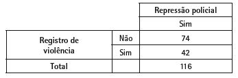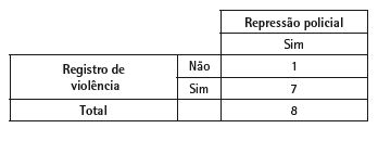 Percebe-se nos dados apresentados uma similaridade entre as variações do uso de violência por parte dos manifestantes e a repressão policial. No entanto, esses dados não são suficientes para identificar um padrão de dependência entre o uso de ações violentas por parte dos manifestantes e a repressão policial. Por tanto, foi realizado um cruzamento entre o uso de violência por parte dos manifestantes com o registro de repressão policial (quando esse foi identificado), afim de tentar se aproximar a identificação de possíveis padrões na relação entre as duas variáveis (Tabela 5).