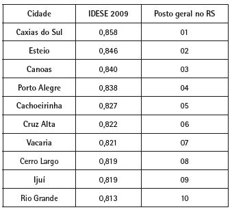 De acordo com os dados do Quadro 2, entre as dez cidades com maior IDESE do estado oito executaram orçamentos participativos em 2009. Ademais, sessenta e dois por cento das cidades com orçamentos participativos no período analisado estão entre os 100 melhores IDESE do Rio Grande do Sul no referido ano. Esses dados, se por um lado não possibilitam estabelecer uma relação causal entre orçamentos participativos e bons indicadores sociais, representam um elemento importante para caracterizar as cidades em questão.