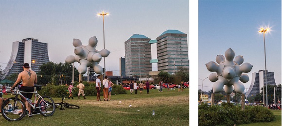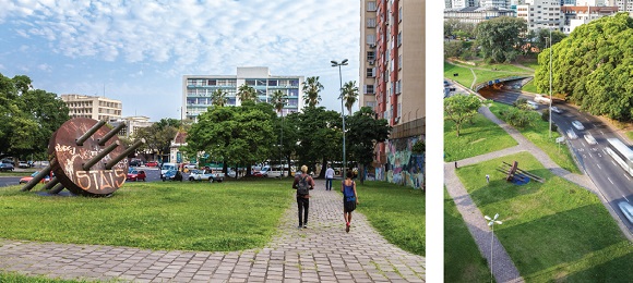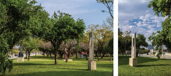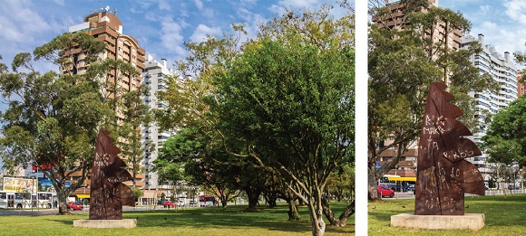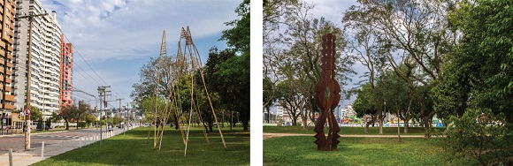 Fonte: fotos de Felipe Rodrigues, Pesquisador BIEV (PPGAS-IFCHUFRGS); acervo BIEV. Porto Alegre, RS, 10-11/09/2017.Em tempos mais recentes, no âmbito das artes públicas, discute-se muito o diálogo que precisaria ocorrer entre a obra artística e a ancestralidade das ambiências e das atmosferas de territórios urbanos (praças, parques, esquinas, ruas, avenidas, viadutos, etc.) em que estão expostas. Estamos nos referindo ao debate das manifestações artísticas de caráter público e ao diálogo que devem ou não manter com a natureza do lugar que a abriga.