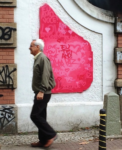 Figure 6. The word love written in many different languages in pink and red. Anonymous artist (2015). Photo credit: Christina Vital da Cunha.