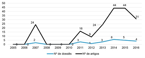 Nota: Não incluímos os dossiês publicados em 2017 por conta da coleta dos dados não ter abarcado todo o ano.Fonte: Elaboração própria com base nos sites dos periódicos.
