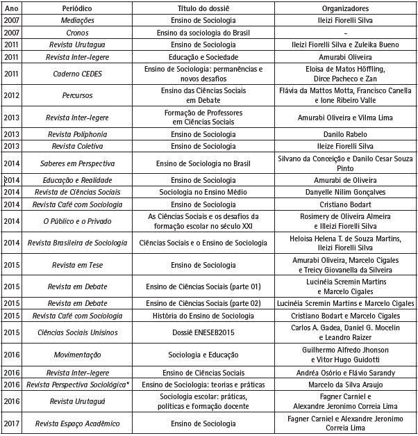 O recorte temporal da pesquisa vai de 2007 ao fim do primeiro semestre de 2017. O uso do ano de 2007 dar-se por ter sido o ano de publicação dos dois primeiros dossiês sobre o ensino de Sociologia. Assim, por desconhecermos dossiês sobre esse tema anterior a essa data, optamos por avaliar o período que abarca todos os dossiês sobre o Ensino de sociologia já publicados no Brasil.