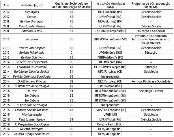 Table 2.Journals that published dossiers on the teaching of Sociology (2007-2017), their Qualis-Periódicos/CAPES standing in the year of publication, and ties with post graduate Masters or Doctorate programs.