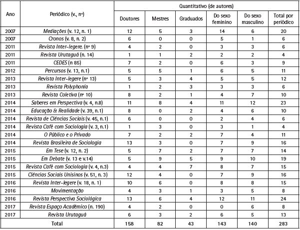 Ao voltarmos nossa atenção aos organizadores e aos autores dos artigos constituintes dos dossiês sobre ensino de Sociologia, buscamos averiguar quatro elementos: (i) titulação; (ii) vinculação institucional; (iii) proximidade com o Ensino Médio e; (iv) sexo. A observação da titulação do autor, sua vinculação institucional e o sexo nos parece ser um meio de observarmos se tal temática é tida como secundária ou periférica, como destacaram algumas pesquisas em torno da constituição desse subcampo. A vinculação institucional também nos permitirá termos um indicativo importante da distribuição geográfica dos pesquisadores brasileiros que se dedicam ou se dedicaram à pesquisa em torno do ensino de Sociologia. A proximidade com o ensino básico pode ser um indicativo de que a experiência profissional teria exercido influência na escolha da temática de pesquisa.