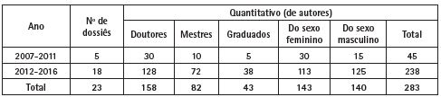 Na comparação dos cinco primeiros anos de publicações de dossiês e os cinco anos posteriores torna-se evidente as seguintes questões: (i) uma ampliação significativa de dossiês no segundo período (2012-2016) quando comparado ao primeiro (2007-2011); (ii) ampliação, em números absolutos, de autores com título de doutor; (iii) incremento na participação de mestres, graduados e graduandos no segundo intervalo temporal analisado, passando de 33,3% para 46,2% e; (iv) nos primeiros cinco anos, 66,6% dos autores eram do sexo feminino, contra 47,7% no segundo período. A mudança da composição de autores acompanha a mudança identificada por Bodart e Silva (2016) na participação de professores dos sexos feminino e masculino nos últimos anos, tendendo a um maior equilíbrio.