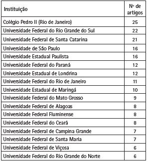 Fonte: Elaboração própria com base nos sites dos periódicos.Notamos, por meio da Tabela 6, a grande presença da Colégio Pedro II, com 25 autores. Esse fato se explica por ter o referido Colégio lançado, em 2016, a primeira edição de uma revista com 17 artigos compondo um dossiê sobre o ensino de Sociologia. Neste, observamos a participação de 19 autores de seu quadro funcional. O destaque institucional, em se tratando da temática ensino de Sociologia, recai, então, sobre a Universidade Federal do Rio Grande do Sul (21) e a Universidade de Santa Catarina (21).