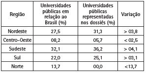 Observando a totalidade das universidades representadas nos dossiês por meio de publicação de alunos e/ou professores, identificamos o quantitativo de 64 instituições de ensino e pesquisa. A Tabela 8 destaca a distribuição desse quantitativo por região brasileira comparando com o percentual de universidades públicas federais e estaduais em cada uma das regiões.