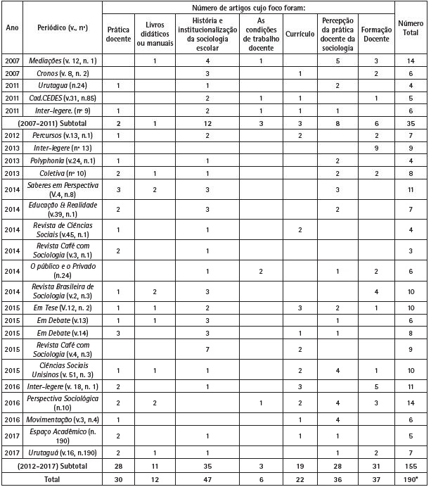 Observamos uma mudança na preocupação presente nos artigos. Nos primeiros anos centrava-se quase que exclusivamente em abordar a institucionalização da Sociologia escolar, enfatizando a importância de sua presença no Ensino Médio; num segundo momento as preocupações se ampliam, girando em torno de como se daria o ensino de Sociologia. Em outros termos: se antes a preocupação era “justificar a permanência da Sociologia no Ensino Médio”, nos últimos anos passou a ser discutir “como está sendo ou deve ser o ensino de Sociologia”. Com a recente reforma do Ensino Médio, pode ser que as preocupações daquele período ressurjam com certa força, o que nos parece ser legítimo e necessário.