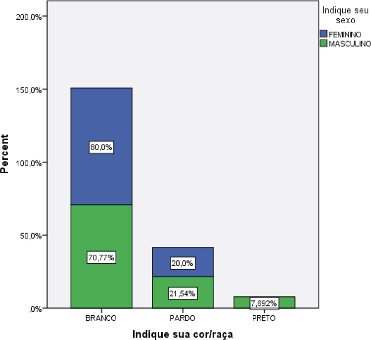 Alguns parâmetros de interesse da amostra (N=80) servem para melhor contextualizar a presente análise. O primeiro deles refere-se à proporção entre as variáveis sexo e raça (autodeclarada) entre os respondentes (Gráfico 1).
