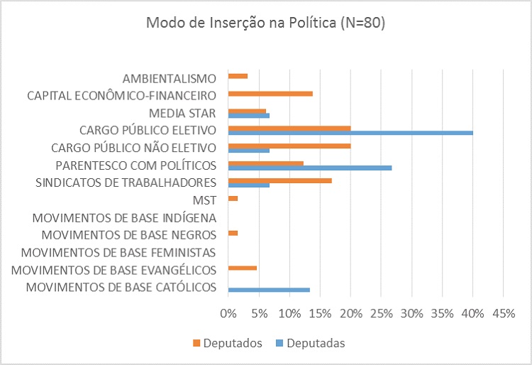 Outro parâmetro de interesse é o modo de inserção na carreira política que aqui se procura identificar através da análise do perfil de cada respondente no que se refere a cargos eletivos e não eletivos ocupados antes do atual mandato, à filiação a movimentos sociais de base, ao papel que a exposição mediática favorável exerceu durante a disputa eleitoral, ao parentesco com políticos consolidados e ao poder econômico. Tal classificação levou em consideração o tipo de “capital” indicado pelos respondentes como fator preponderante para seu ingresso no campo político. A tipologia adotada se insere numa malha social formada por recursos, saberes e legitimidades na qual transitam os agentes políticos. Por “capital político”, entendemos aquele tipo de capital simbólico que confere reconhecimento e legitimidade ao indivíduo para agir na política, compreendendo desde treinamento cognitivo para ação política até as redes de relações sociais e o poder econômico. Como toda forma de capital, o capital político é distribuído de modo assimétrico na sociedade (Bourdieu, 1989).