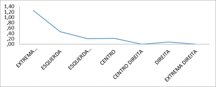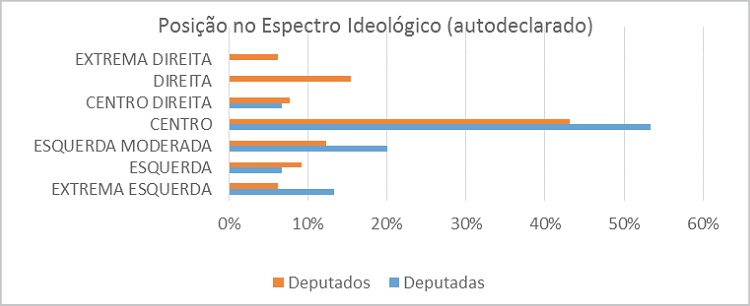 A posição autodeclarada no espectro ideológico, sem a clivagem de sexo, é outra variável que pode indicar correlações importantes com a produção legislativa. Quase metade dos respondentes (45%) se identifica com o “centro”, que pode ser definido como “uma combinação de ideias que caracteriza a ex-pectativa de um Estado suficientemente forte para diminuir as desigualdades sociais, mas sem ameaçar a ordem estabelecida” (Singer, 2009, p. 84). A preferência por essa zona ideológica de conforto confirma a aversão às polarizações ideológicas que caracteriza nossa cultura política.