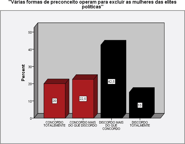 De fato, pesquisa feita pelo Senado Federal (2014), revelou que que 87% das mulheres entrevistadas nunca havia pensado seriamente em candidatar-se a um cargo político. A pesquisa revelou ainda que, na visão das entrevistadas, o motivo mais frequente (apontado por 41% delas) para que as mulheres deixem de se candidatar é a “falta de apoio dos partidos”, seguido da “falta de interesse por política” (23%). A aparente falta de interesse das mulheres pela política encontra raízes em fatores culturais, como a diferenciação de papéis de homens e mulheres na sociedade. Por ocupar o espaço público, a política (ϖόλις) sempre foi considerada um domínio masculino, enquanto que às mulheres foi reservado o espaço doméstico (οίκος). Tal percepção, fortemente enraizada na cultura popular (“lugar de mulher é na cozinha”), não poderia deixar de se refletir nas respostas à questão “várias formas de preconceito operam para excluir as mulheres das elites políticas”, com a qual 45% dos respondentes concordaram.