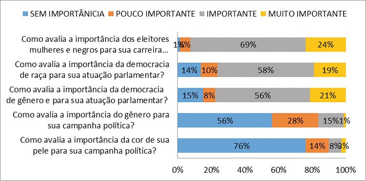 Já as questões referentes à importância - para atuação parlamentar e campanha política - do “eleitorado negro e feminino” (93%), da “democracia de raça” (77%) e da “democracia de gênero” (79%), receberam altos escores positivos, o que parece indicar uma percepção diferenciada dessas categorias: quando associadas a “eleitores” ou à “democracia”, tanto o “gênero” quanto a “raça” parecem ser ressignificadas e remeter para ideias pragmáticas de “obtenção de votos” ou de “igualdade para todos”. Pode indicar também uma tendência a uma estratégia “inclusiva”, que, por razões pragmáticas, procura de-enfatizar essas clivagens sociais (McCormick e Jones, 1993).