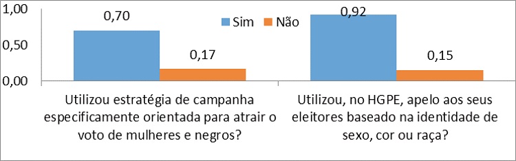 Outro indicador de atuação parlamentar é a relação entre índice de produção legislativa (eixo y) e estratégias de campanhas (eixo x), aqui representadas por duas variáveis nominais: “sim” ou “não” para identificar os parlamentares que utilizaram as categorias de gênero e raça em suas campanhas eleitorais. O Gráfico 10 mostra uma relação positiva entre escores elevados de produção legislativa (M=0,70 e M=0,92) e a utilização de estratégias de gênero e raça em campanhas eleitorais.