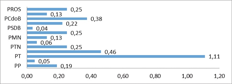 Por outro lado, a relação entre filiação partidária e produção legislativa revela que o Partido dos Trabalhares (PT) é a agremiação com os maiores escores de produção de leis para a defesa e promoção dos direitos da mulher e dos negros (1,11), quase três vezes o segundo colocado, o PMDB (0,46). Tal resultado se deve, por um lado, ao fato de que o PT é a agremiação com maior número de deputadas nas três Assembleias (26%). Por outro lado, a estreita vinculação do PT com movimentos de base feminista e negro, nos três estados analisados, fomenta uma cultura política interna naturalmente sensível às questões de gênero e raça.