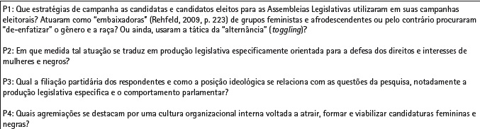 O sistema eleitoral brasileiro fornece incentivos máximos para o cultivo do “voto pessoal” (Carey e Shugart, 1995). Por um lado, uma série de características institucionais de nosso sistema (e.g., a baixa fidelidade partidária) fomenta estratégias de representação que enfatizam fatores pessoais, como capacidade de liderança, competência administrativa e visibilidade midiática entre outros. Por outro lado, quaisquer que sejam suas características individuais - independentemente do gênero e de origens étnicas ou raciais -, os parlamentares são, antes de tudo, candidatos de um partido ou de uma coligação de partidos, cuja prioridade é obter uma pluralidade de votos em suas bases eleitorais para serem reeleitos. Com base em tais pressupostos, formulamos as perguntas que constam no Quadro 1.