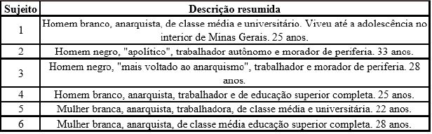 deve-se tanto à necessidade de proteção de si mesmos contra a identificação policial, quanto pelo “simbolismo do anonimato”, como preconizado pelo Exército Zapatista de Libertação Nacional. Além disso, conforme apontam algumas pesquisas, black blocs não são senão uma formação de todo efêmera, volátil, em constante transformação e que raramente coincidem significativamente no que diz respeito às pessoas que o constituem (Dupuis-Déri, 2014). Diante desses empecilhos, optamos por fazer uso do método bola-de-neve para a seleção da amostra a ser entrevistada. Essa escolha pareceu-nos a mais adequada por uma razão em especial: nós não teríamos que definir, a partir de nossas próprias categorias de pensamento, quem era, ou não, constituinte de black blocs, a não ser a primeira pessoa entrevistada. Isso possibilitou que a própria amostra se definisse, garantindo assim sua fiabilidade (Fragoso et al. 2013), e certificando-nos, eventualmente, de que ela não ficasse restrita a um grupo social específico. Abaixo, apresentamos um sumário do perfil das seis pessoas assim selecionadas.