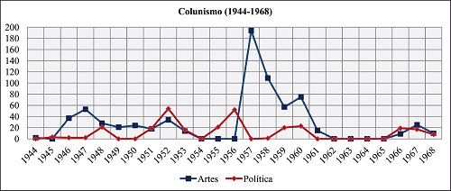 Durante o período de correspondente internacional, o crítico raramente assinou suas colunas de artes visuais. Prática comum quando eram notas sobre exposições e cursos; reproduções de cartas enviadas por seus leitores, de manifestos de grupo de artistas e de estatutos de museus e divulgação de textos de críticos de arte internacionais. Ao coletar seus textos na imprensa, excluí os anônimos. A divisão da produção pedrosiana no CM entre artes e política no Gráfico 1 tem como critério a divisão aceita por seu autor mesmo, uma vez que seus textos ora eram impressos na página cultural ora na página política. Destarte, mesmo os perfis de políticos estão incluídos na linha das artes, por não se tratarem de textos de intervenção política em sentido estrito. Os textos políticos de Pedrosa no CM eram sazonais e restritos - concentraram-se em um período de tempo bem demarcado, como demonstra o Gráfico 1.