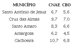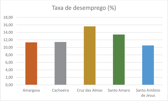 Os números dos municípios aqui selecionados demonstram essa tendência. Santo Antônio de Jesus (10,51%), Cruz das Almas (15,60%), Santo Amaro (13,42%), Amargosa (11,34%) e Cachoeira (11,44%). Por conta desse contexto de baixo dinamismo do mercado de trabalho local, foi se constituindo historicamente um constante e intenso fluxo de indivíduos do Recôncavo em direção a Região Metropolitana de Salvador ( PEDRÃO, 2007).