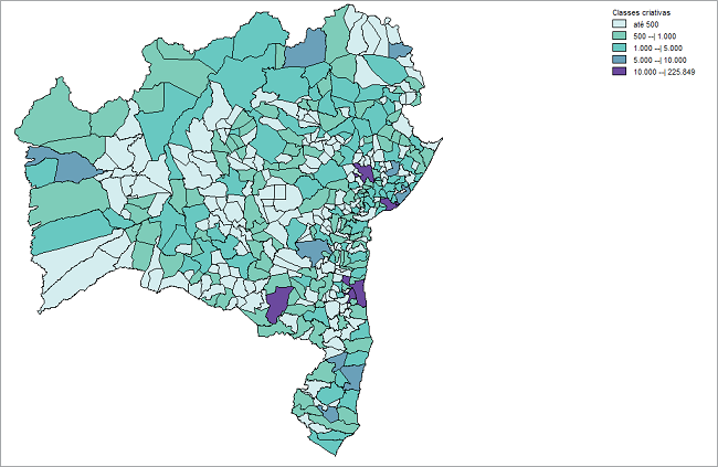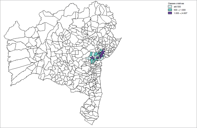As classes criativas correspondem a 11% dos trabalhadores da Bahia, sendo que 4,2% deles está no Recôncavo. O mapa 1 mostra a distribuição, em termo absolutos, dos profissionais criativos na Bahia e o Mapa 2 marca os municípios do Recôncavo com o número das classes criativas.