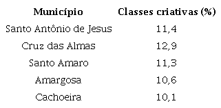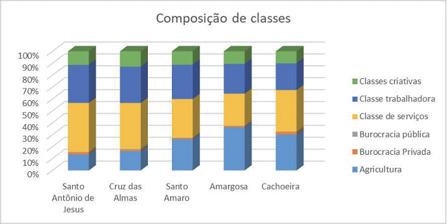 Em termos gerais pode-se afirmar que a força de trabalho dos munícipios concentra-se nos setores de serviço e em postos com baixo grau de especialização. Evidentemente, a tendência histórica para os segmentos agromercantis permanece. Nota-se que em Santo Amaro, Amargosa e Cachoeira, a agricultura mantém sua relevância no cenário econômico local e a classe de serviços é bastante dinâmica nas cinco cidades – ao contrário das classes Burocracia Privada e Burocracia Pública, pouco representativas na amostra. As classes criativas, por sua vez, somam mais do que 10% em cada município.