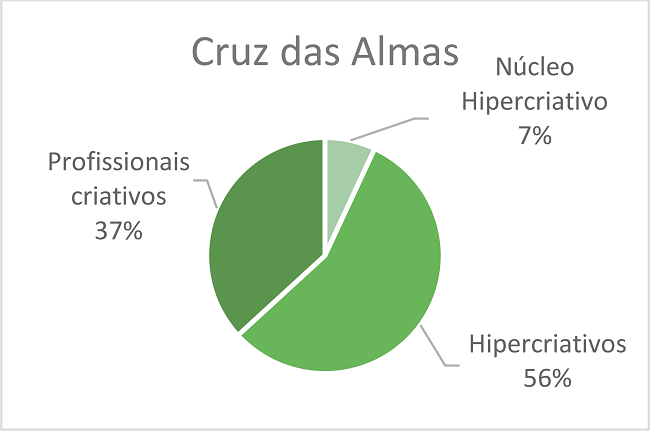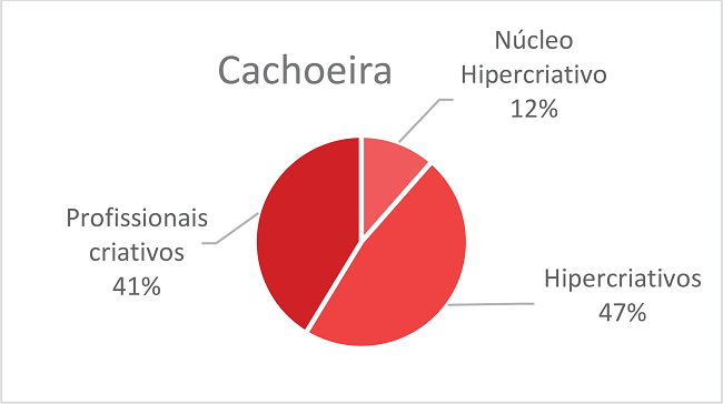 Esta forma de organizar as informações resulta em uma nova leitura e, por isso, outras formas de se relacionar com os dados. Ao exemplo de que, diferente do percentual das classes criativas, Cachoeira não apresenta os menores números, pelo contrário, parece a mais dinâmica de acordo com o CNAE (10,7%) e a segunda pelo CBO (6,8%). Entretanto, apesar dos resultados parecerem distintos, ao colocarmos em diálogo, é possível que seja explicado através da relevante parcela representada pelo Núcleo Criativo. Afinal, é neste componente onde ocupações como arte e entretenimento estão.