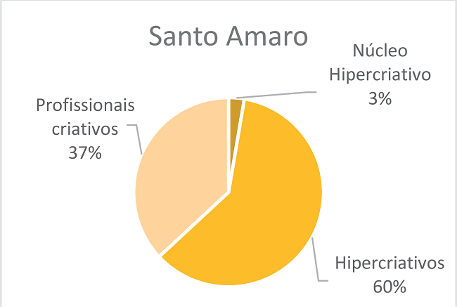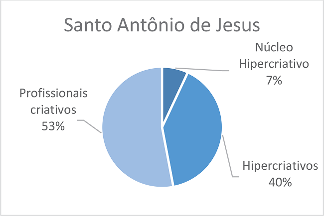 Percebe-se, por meio da análise dos gráficos, que Santo Antônio de Jesus é o único dos municípios cujos profissionais criativos – aqueles que incluem as profissões gerenciais e de vendas ou ligadas ao direito e à área da saúde –, representam uma parcela maior do que os hipercriativos – em que as profissões associadas à computação, à arquitetura e engenharia, tal como às ciências biológicas, naturais e sociais estão em evidência. Há de se destacar que Santo Antônio de Jesus tornou-se um importante centro econômico que abastece a região. Dispõe de um comércio pujante, com ênfase na distribuição de alimentos. Além disso, concentra um número significativo de serviços voltados para cuidados médicos e de saúde que atende a região, além de sediar uma fábrica de medicamentos e suplementos alimentares. Decorre daí o acentuado dinamismo dos profissionais criativos.