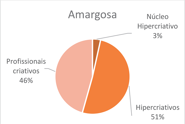 De modo geral, embora entre em disputa com os profissionais criativos, os trabalhadores atuantes no “Hipercriativo” detêm a maior fração das classes criativas diante do contexto proposto. Em contrapartida, os trabalhadores que desenvolvem atividades ligadas ao “Núcleo Criativo” não comparecem no gráfico de forma tão expressiva, apontando assim para um dos limites dos indicadores agregados. Isto porque, pelos indicadores não é possível capturar o contingente de amadores e profissionais inclusos na informalidade, que se configuram como a grande força que dão vida às manifestações e expressões da cultura popular, especialmente em regiões como o Recôncavo.