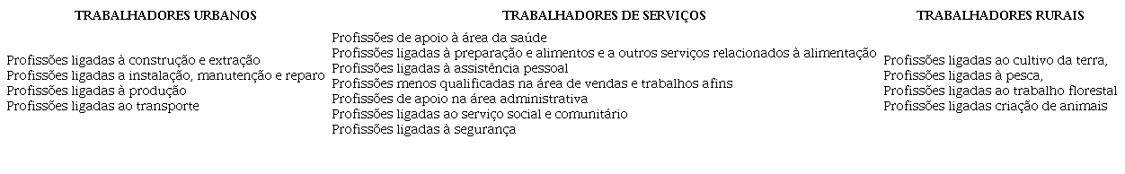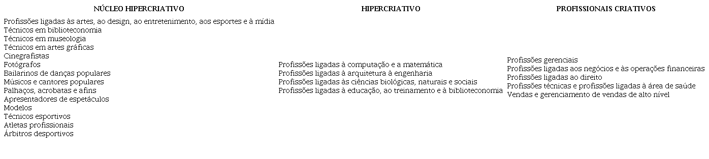 No nosso quadro classificatório foram consideradas as seguintes classes sociais: agricultura, burocracia pública, burocracia privada, classe de serviços, classe trabalhadora. Nele também estão as chamadas classes criativas, classificação que elaboramos a partir da adaptação do conceito de Richard Florida. Distinguindo-se de Florida, subdividimos o “Núcleo Hipercriativo”, criando uma nova categoria, o “Hipercriativo”. Enquanto no primeiro componente estão agregadas as atividades ligadas às políticas culturais do Ministério da Cultura (MinC), além das relacionadas ao esporte, no componente “Hipercriativo” são agrupadas atividades culturais mais gerais, ligadas à educação e à tecnologia. Por outro lado, conservamos o componente “Profissionais Criativos” seguindo a natureza das atividades sugerida pelo modelo de Florida.