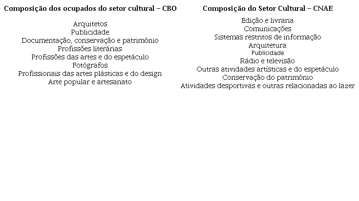 Portanto, o quadro acima especifica as ocupações que compõem o setor cultural de acordo com o CBO e, ao lado, descreve as áreas consideradas na contagem do setor cultural pelo CNAE, nas quais os indicadores aqui construídos se sustentaram.