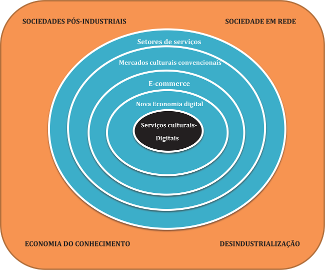 Como demostra a figura 1, os serviços culturais-digitais constituem o núcleo de diferentes camadas da economia das sociedades pós-industriais em rede. O primeiro círculo abarca os infinitos setores de serviços, alguns dos quais exigem ocupações e profissões com elevada especialização técnica e complexas habilidades intelectuais e cognitivas (como os serviços de saúde, segurança digital e aviação) outros envolvem ocupações precarizadas e com habilidades pouco valorizadas (como os serviços de limpeza). Os mercados culturais convencionais, segundo círculo, corresponde as atividades de comercialização e consumo de dos bens culturais praticados ao vivo, de maneira off-line. Esses mercados, cinema, televisão, artes cênicas, música e mercado editorial cresceram muito nas sociedades ocidentais entre as décadas de 1950 e 1990. São ainda mercados robustos, mas sofreram inflexões definitivas, a mais relevante delas o ingresso das principais corporações de tecnologias digitais do mundo. O terceiro círculo da figura corresponde às operações de compra e venda pela internet através de sites especializados, sejam eles de roupa, livros, eletrodomésticos, produtos eletrônicos em geral, móveis, passagens aéreas, e uma infinidade de outros produtos e serviços. Essa foi a primeira esfera econômica a se expandir com o advento e a profusão da internet desde meados dos anos de 1990. De acordo com o Global Digital Yearbook, em 2018, 28% da população feminina, com 15 anos ou mais de idade, de todo o mundo, realizou compras online, ao passo que a população masculina foi de 30%. Dentre as compras realizadas através da web, o e-commerce, os percentuais entre os segmentos se dividiram da seguinte forma, em todo o mundo: moda e beleza correspondeu a US$ 525 bilhões; eletrônicos e mídias físicas correspondeu a US$ 392 bilhões; comida e cuidados pessoais corresponderam a um total de vendas de US$ 209 bilhões; móveis e eletrodomésticos alinhavaram um total de vendas de US$ 272 bilhões; brinquedos e artesanato correspondeu a um total de US$ 386 bilhões; já as viagens corresponderam US$ 750 bilhões; música digital, por sua vez, abarcou a quantia de US$ 12 bilhões, e os videogames alcançaram uma vendagem digital de US$ 70 bilhões. O quarto círculo concêntrico abarca uma esfera inteiramente nova, cujo crescimento redefiniu o modo como se hospeda, se desloca nos centros urbanos e como se alimenta. Trata-se da nova economia digital, que tem no seu centro a chamada inovação disruptiva, resultado do crescimento dos aplicativos digitais como Uber (maios plataforma de serviço de transporte do mundo), o Airbnb (maior plataforma online de serviços de hospedagem) e Ifood (maior plataforma digital de serviços de alimentação). Por fim, a figura 1 apresenta no seu núcleo os serviços culturais-digitais, que, como modelo de negócio mais exitoso, consiste na oferta de serviços de assinatura digital mensal, por meio da tecnologia instantânea e online de streaming, de conteúdos de séries, filmes, games, livros, jornais e serviços educacionais. As maiores corporações de tecnologia digital do planeta, como Google, Amazon, Facebook, Apple e Microsoft (GAFAM), passaram a investir significativas somas no desenvolvimento dos seus próprios serviços de streaming, desencadeando uma das maiores competições econômicas deste início de século.
