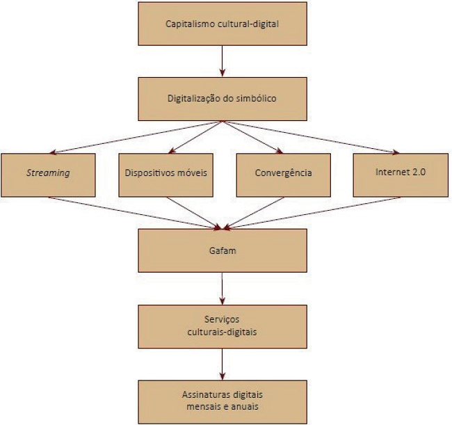 Os serviços culturais existem, por sua vez, em razão de quatro processos conjugados, que urdiram o processo de digitalização do simbólico, que, como corolário, plasmou o capitalismo cultural-digital. São os seguintes processos: 1) advento da tecnologia de transmissão e distribuição contínua de daFonte: elaboração do autor dos online, o streaming, que, nos últimos cinco anos, passou a permitir que series, filmes, vídeos, games e demais conteúdos audiovisuais possam ser consumidos instantaneamente sem a necessidade de aguardar um determinado tempo para baixar (download); 2) a profusão dos dispositivos digitais móveis, especialmente os smartphones, cujo número já é de 5.1 bilhões em todo o planeta, amparado nas bandas largas móveis 3G e 4G; 3) a convergência digital, que permitiu que as diversas mídias e linguagens convergissem para um único aparelho e suporte, o smartphone; 4) o advento e a profusão da internet 2.0, fase da web em que a grande maioria dos usuários (cerca de 75%) produz, distribui e consome os conteúdos (informações, fotografias, textos, imagens, vídeos, música, etc.) que circulam na web. Nos últimos cinco anos, em meio a conjugação desses processos, as companhias que compõem o GAFAM (Google, Amazon, Facebook e Microsoft) passaram a investir na criação dos seus serviços-culturais digitais, conferindo os contornos definitivos ao capitalismo cultural-digital.