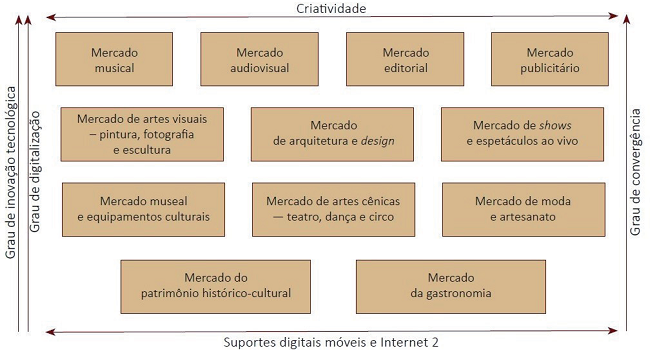 Para que esse aspecto fique claro é preciso compreender o que são os serviços culturais-digitais. Um bem simbólico-cultural é todo conteúdo (editorial, teatral, fotográfico, audiovisual, visual, pictórico, etc.) comercializado e consumido in loco, ou seja, no local onde é apresentado, exibido e consumido – em um museu, galeria, teatro, cinema, ópera, entre outros. Uma peça de teatro, um filme exibido na tela de um shopping center, uma exposição em uma galeria ou no interior um museu, um espetáculo de dança, realizado numa sala de teatro ou concertos, e um show musical, ocorrido em um grande espaço público, são todos bens culturais. Se por acaso esses conteúdos forem todos transmitidos, de forma gratuita ou não, em plataformas especializadas, como o Youtube, por exemplo, tornam-se serviços culturais-digitais. Esses, por usa vez, são apenas mais um dos muitos e possíveis mercados e esferas de negócios existentes no interior da web, cuja expansão e diferenciação, especialmente nos últimos vinte anos, produziu uma serie de diferenciações nas economias pós-industriais de serviços ou nas chamadas economias do conhecimento (Castells, 2014).