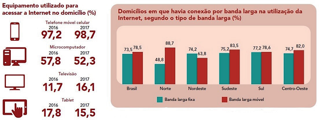 De acordo com o IBGE, em 2017, 75% dos domicílios permanentes no Brasil dispunham de acesso à internet. Do total de domicílios que dispunham de internet, 98,7% acessaram a rede por meio do aparelho celular móvel, o smartphone. Sendo que 43,3% acessaram a rede exclusivamente por meio do smartphone. No escopo total do uso da internet, predomina a conexão via banda larga móvel (3G e 4G). Do total da população brasileira que utilizava a internet em 2008, 53% acessava a rede todos os dias ou quase todos os dias. Oito anos após, em 2016, esse percentual subiu para 86% (CGI-BR, 2018). O gráfico 1 revela a recente dinâmica de expansão da internet no Brasil.