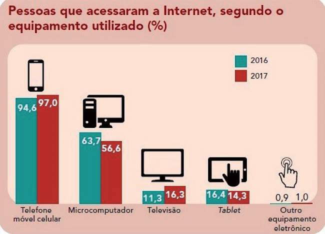 Em 2017, de todo o universo da população brasileira entre dez anos ou mais de idade (181 milhões de pessoas), 70% utilizaram regularmente a internet, crescimento significativo comparado com o ano anterior, que era de 64,7% ( PNAD/IBGE 2019). Novamente predomina, entre esse universo populacional, o uso do smartphone para acessar a internet. Como assinala o gráfico 2, há um declínio bastante significativo do uso do microcomputador para acessar a internet, especialmente entre as faixas etárias mais jovens e os estratos mais pobres da população.