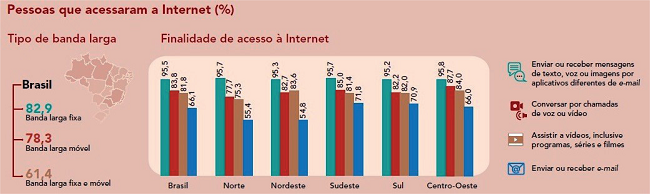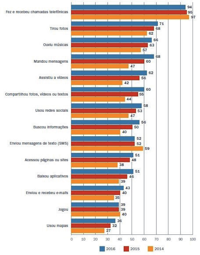 De acordo com o Comitê Gestor de Internet no Brasil (CGI-BR), em 2016, entre os estudantes brasileiros de nove a dezessete anos de idade, 93% acessavam a internet por meio do smartphone. Desses, 77% acessaram a rede para assistir filmes, séries, programas e outros 75% o fizeram para ouvir música. Mesmo entre os estratos mais pobres, com renda mensal bastante reduzida, tem ocorrido uma expansão significativa do uso da internet. De acordo com o IBGE, em 2013, 22,8% da população brasileira que recebia entre ¼ e ½ de salário mínimo dispunha de acesso à internet. Dois anos depois, em 2015, esse percentual saltou para 45%, um crescimento substancial em apenas dois anos. No estrato que recebia entre ½ salário mínimo e 1 salário mínimo também ocorreu um significativo avanço. Em 2013, 43% da população situada nesse estrato de renda acessava a internet, em 2015 esse percentual subiu para 54,7%. O gráfico 3 demonstra como no Brasil, assim como em diversas outras partes do mundo, no uso da internet predomina a troca de mensagens de texto e de voz através de aplicativos como o Whatsapp. Salta aos olhos ainda, e esse é o aspecto que, no caso brasileiro, mais interessa a empresas como Netflix, Disney e Apple, 81,8% de toda população brasileira com dez ou mais anos de idade que utiliza a internet (o que representa 126,7 milhões de brasileiros) utilizaram a internet para assistir vídeos, séries e filmes.