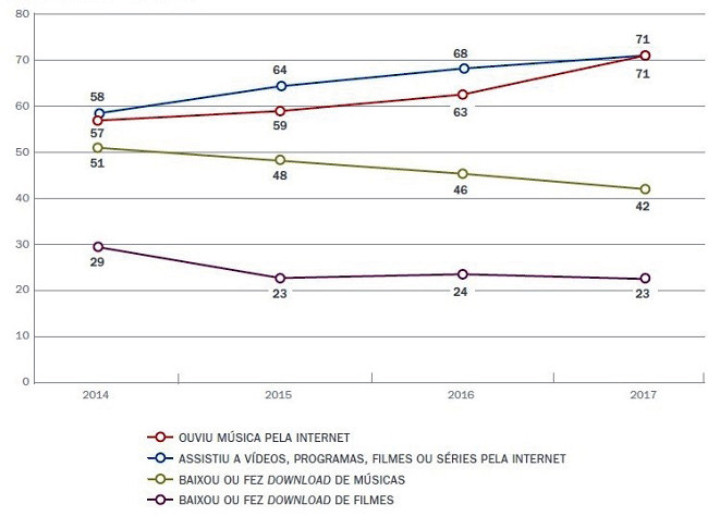 Os dados mais recentes, que abarcam o ano de 2017, registram um crescimento ainda maior no consumo de conteúdos de séries, filmes, músicas e games, assim como evidencia a força da tecnologia instantânea do streaming. Como comprova o gráfico 6, o crescimento no consumo de filmes, séries, programas, vídeos e música através dos smartphones não só cresceu como também foi potencializado pela velocidade de dados que essa tecnologia permite em comparação à prática de baixar os conteúdos – download. De acordo com o CGI-BR, em 2014, 58% do total de usuários de smartphones no Brasil (126,7 milhões de brasileiros com mais de dez anos de idade) utilizaram o aparelho para consumir séries, filmes, programas e vídeos. Em 2017, esse percentual subiu para 71%, um crescimento bastante acentuado em apenas três anos. Do mesmo modo, 57% utilizaram o aparelho, em 2014, para ouvir música através da internet, percentual que chegou, em 2017, a 71%.