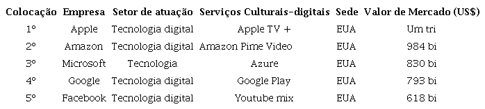 No interior de cada um dos mercados culturais apresentados na figura 3 atuam cinco agentes econômicos estruturais, que dispõem de mais ou menos poder dependendo do maior recurso financeiro de investimento aplicado pelas empresas, do poder de renda dos consumidores, da legislação vigente em cada estado nacional e das políticas de estímulo aos processos criativos e à valorização das ocupações desenvolvedoras de conteúdos existentes em diferentes contextos locais, regionais e nacionais. São os seguintes agentes: 1) empresas culturais especializadas; 2) bancos privados; 3) profissionais e trabalhadores criadores de conteúdos; 4) instituições estatais-governamentais e 5) os consumidores. No caso dos mercados culturais mais digitalizados, mais inovadores tecnologicamente e que apresentam o maior grau de convergência digital (os mercados musical, audiovisual, editorial e publicitário), o primeiro agente econômico, as empresas culturais, são também empresas de tecnologia, que, muito recentemente, passaram a investir na criação, desenvolvimento, licenciamento, distribuição e comercialização de conteúdos artístico-culturais: músicas, filmes, séries, games, livros, entre outros. Essas empresas passaram a adotar modelos de negócios voltados para os serviços culturais-digitais, oferecendo serviços mensais de assinaturas de acesso aos variados conteúdos artístico-culturais. Essas empresas são Google, Amazon, Facebook, Apple e Microsoft – GAFAM. Como assinalado antes e como demonstra a tabela 3, essas são também as maiores corporações privadas do planeta.