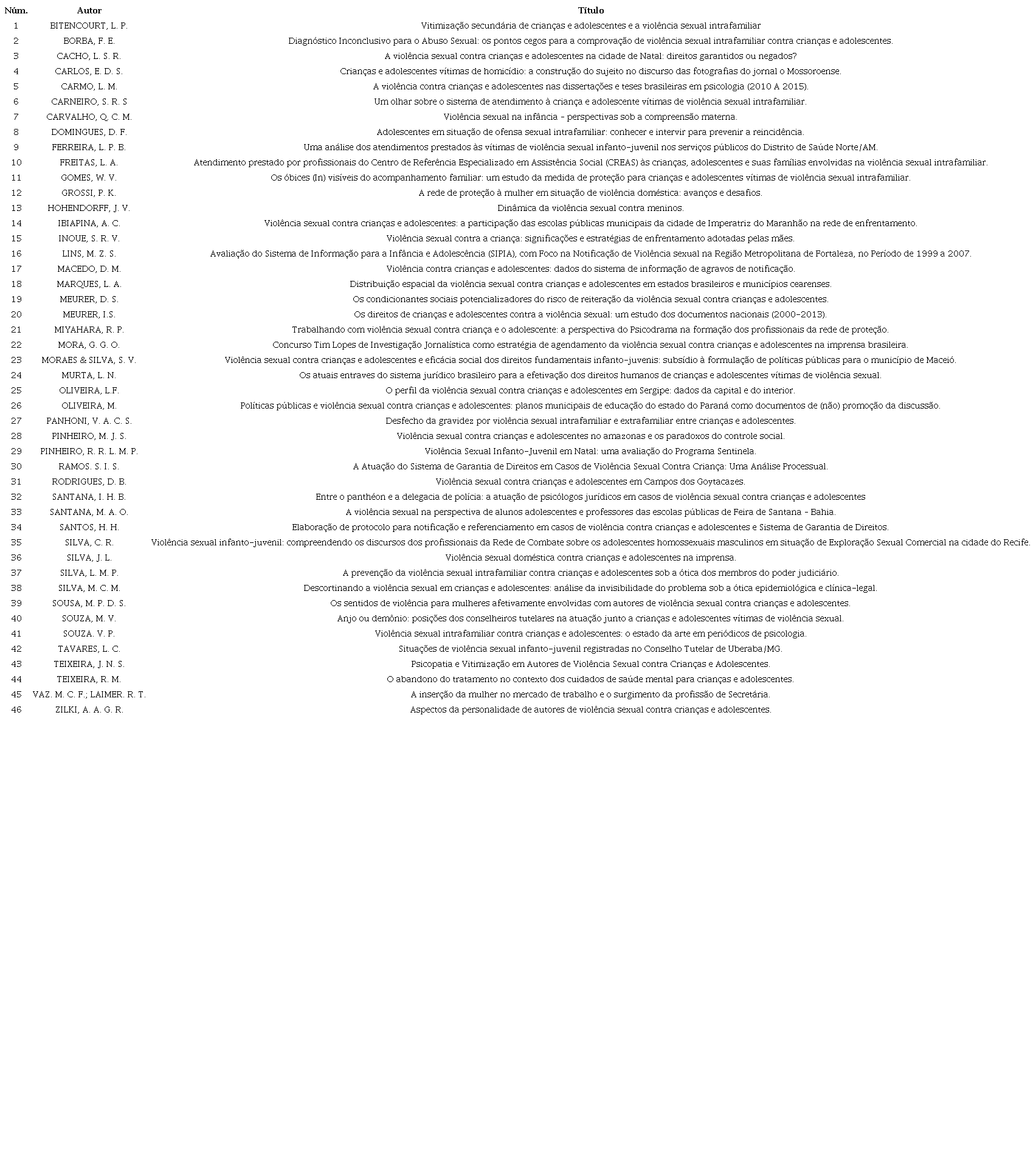 Abstract: We propose to conduct a systematic literature review of postgraduate research, which relevant information on the issue of sexual violence against children and adolescents in Brazil. After the selection of 46 researches, we identify the prevalence of research carried out in Public Institutions (IFES) located in the Northeast and Southeast regions. Regarding the profile of the victims, sexual violence against girls prevails, and the risk of violence increases as they approach adolescence (between 12 and 14 years old). It was quite clear that the theme should be understood from a multidisciplinary aspect, thus requiring articulation between the various social actors involved in the formulation of public policies aimed at protecting children and adolescents.