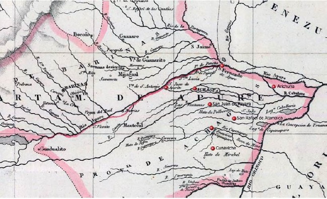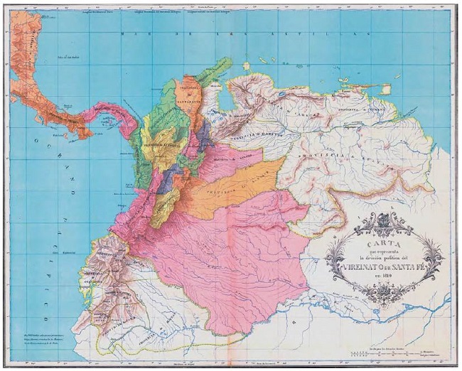 Para una mejor percepción del espacio territorial al que hago referencia, dejo a continuación un detalle del mapa que representa la división política del Virreinato de Santafé en 1810, tomado del Atlas geográfico e histórico de la República de Colombia de 1890. Los Llanos son una región que actualmente se encuentra repartida entre Colombia y Venezuela en la cuenta del río Orinoco.