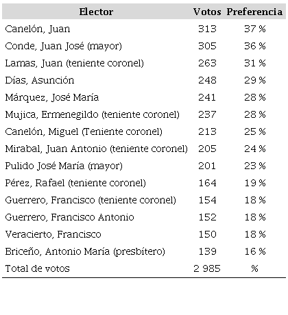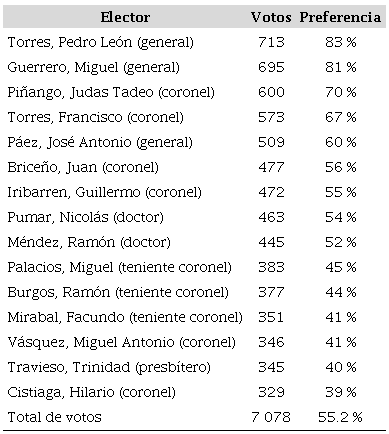 Como podemos ver en los siguientes cuadros (2 y 3), la participación abrumadora de los ciudadanos al servicio de las armas (71 %) favoreció indudablemente la balanza a favor de los oficiales de más alto rango del Ejército Libertador, aunque no podemos despreciar la popularidad de los doctores Pumar y Méndez al ser reconocidos como representantes de la provincia en antiguas asambleas legislativas. Así, los 15 electores parroquiales principales concentraron poco más del 55 % de las preferencias para un total de votos emitidos de 7,078; en cambio, los electores parroquiales suplentes -fue mayor el número de candidatos- sólo aglutinaron el 23 % de favoritismo para un total de votos emitidos de 2,985.