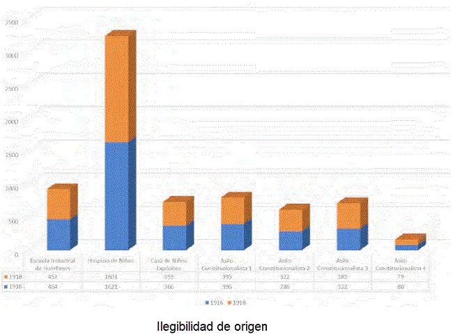 El promedio mensual de niños que ingresaban a los asilos constitucionalistas fluctuaba entre 200 y 400. En marzo de 1916 la Dirección General de Beneficencia elaboró un cuadro general del movimiento anual y mensual de niños que fueron enviados a la Escuela Industrial de Huérfanos, Hospicio de Niños, Casa de Niños Expósitos y los cuatros asilos constitucionalistas. En la siguiente gráfica simplificamos dicha información. No disponemos de información del año de 1917, pero podemos apreciar que el número de ingresos se mantuvo más o menos constante entre 1916 y 1918, años críticos debido a la pobreza imperante y diseminación de enfermedades infecciosas en la ciudad de México. El Hospicio de Niños fue el que hospedó el mayor número de niños. Los asilos constitucionalistas mantuvieron casi el mismo número de ingresos. En abril de 1916 la directora del asilo número 1, Antonia Landgrave viuda de Flores manifestó que el número de asilados ascendía a la cantidad de 405 personas, la mayor parte niños de 8, 10, 12 y 14 años.47