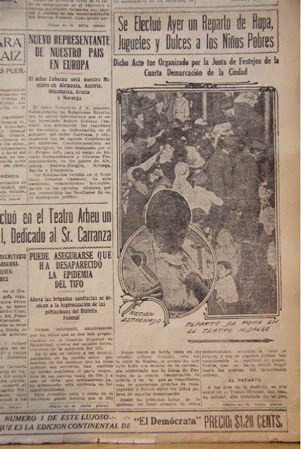 ¿Qué tipo de personal era el que laboraba en estos asilos? En los proyectos de reglamentos de los asilos se describen la función de cada uno de los empleados. A diferencia del periodo porfirista, cuando predominaban los hombres en la dirección de los establecimientos de la Beneficencia72, en los asilos constitucionalistas predominaban las mujeres. Algunas de las directoras de los asilos eran viudas, como las que dirigían los asilos número 2 y 3: las señoras Eloísa Viuda de Rivera y Esther Viuda de Franco, respectivamente. Es posible que se trataran de personas de la élite que ofrecieron sus servicios para dirigir estos establecimientos. La directora del asilo número 4 era la señora Herlinda Orive y en 1917 la señora Concepción Gavira se hizo cargo del asilo número 2. Presumimos que estas mujeres eran personas allegadas a la elite carrancista. La propia esposa de Carranza encabezó muchas de las labores benéficas de estos asilos. Por su parte, la Junta de Festejos de la cuarta demarcación de policía realizó un acto en el Teatro dicha demarcación en la que se repartió más de 500 prendas de vestir, juguetes y dulces entre los niños pobres. Desde las primeras horas de la mañana un “buen número de niños menesterosos ocuparon la calle de Regina, en donde estaba el teatro, y tal cantidad de niños que era difícil llegar hasta las puertas del teatro”.73