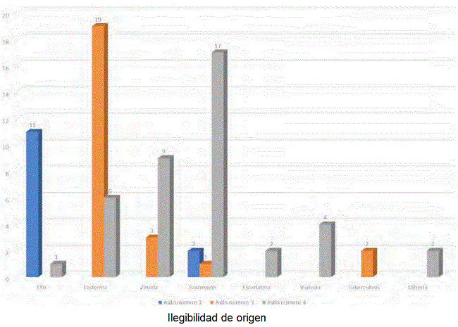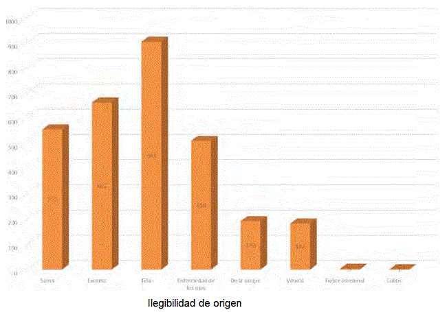 Cabe referir que precisamente en este asilo se llevó a cabo un registro pormenorizado de las enfermedades de las asiladas. En las siguientes gráficas observamos una gran cantidad de niñas con problemas de la piel: sarna, excema y tiña, padecimientos que podrían ser consecuencia de falta de higiene y una deficiente alimentación. La “enfermedad de los ojos” podría tratarse de conjuntivitis, asociado también a malos hábitos higiénicos. En relación con el tifo exantemático y otras enfermedades infecciosas, sabemos que entre octubre de 1915 y septiembre de 1916 un total de 129 niños de los asilos, casas de huérfanos y escuelas fueron trasladados a los distintos hospitales de la ciudad de México.