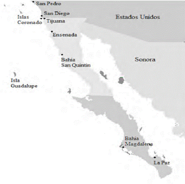 Entre los años de 1780 y 1880 los recursos naturales de las costas de Baja California fueron descubiertos y registrados por cazadores de ballenas, pescadores asiáticos y europeos, “mercaderes aventureros” y científicos del Este de Estados Unidos que llegaron al Oeste para conocer su geografía y explotar de modo incipiente su flora y fauna. La información sobre la disponibilidad de recursos en esta región y la posibilidad de aprovecharlos se divulgó con amplitud gracias a memorias y reportes de marineros, científicos así como a noticias de hombres de negocios que se difundieron por medio de periódicos, libros y boletines durante la segunda mitad del siglo XIX y la primera década del XX.4 Por cuestiones científicas y de negocios productivos así como especulativos, el territorio que comprende California y Baja California comenzó a ser poblado por colonos, mineros, rancheros, cazadores y pescadores que construyeron asentamientos temporales y permanentes.5