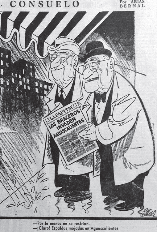 En esta imagen, se aprecia el título del periódico que refiere a la presencia masiva de braceros (tanto de los candidatos decepcionados como de los deportados). Abajo, la discusión entre los dos hombres de clase media alta señala la poca consideración que tiene por el devenir de estos migrantes: